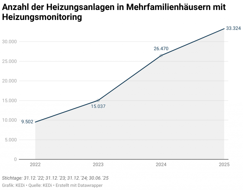 Die Heizsaison ist in vollem Gange und mit ihr ein bekanntes Problem: Viele Heizungsanlagen in Deutschland arbeiten ineffizient. Dabei sind digitale Lösungen zur Überwachung und Optimierung des Heizbetriebs längst verfügbar. Den aktuellen Stand zeigt die Umfrage „Digitales Heizungsmonitoring in deutschen Mehrfamilienhäusern“ des Kompetenzzentrums für Energieeffizienz durch Digitalisierung (KEDi) unter Technologieanbietern. Positiv ist, dass die angebotenen Lösungen mehr in die Anwendung kommen – in den vergangenen drei Jahren verzeichneten die teilnehmenden Unternehmen jährliche Wachstumsraten von mehr als 50 Prozent. Allerdings geht dieses Wachstum von einem niedrigen Gesamtniveau aus, und es wären deutlich höhere Zuwachsraten möglich. Laut Umfrage sind digitale Lösungen derzeit nur in etwas mehr als vier Prozent der Mehrfamilienhäuser im Einsatz.